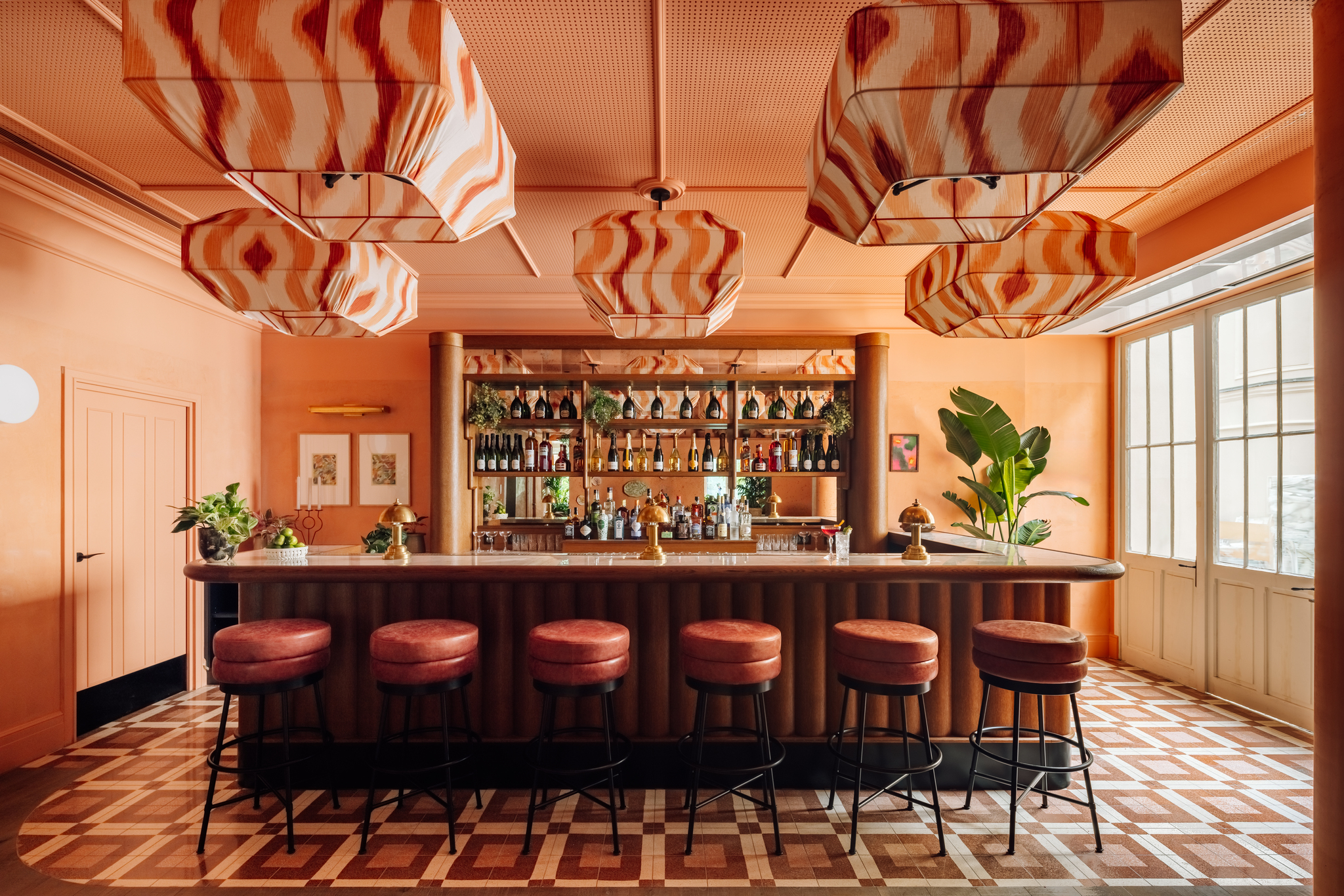 The entrance courtyard features original stone flooring with striped yellow banquettes, rattan chairs and outdoor lanterns, immediately creating a sophisticated yet playful setting.Ā The main entrance to the hotel draws the outside in with green walls and a subtle light green ceiling. The terracotta toned tiled floor is punctuated with colourful soft furnishings and lush foliage. The bespoke graphic mural behind the reception desk creates a contemporary focal point to the space.