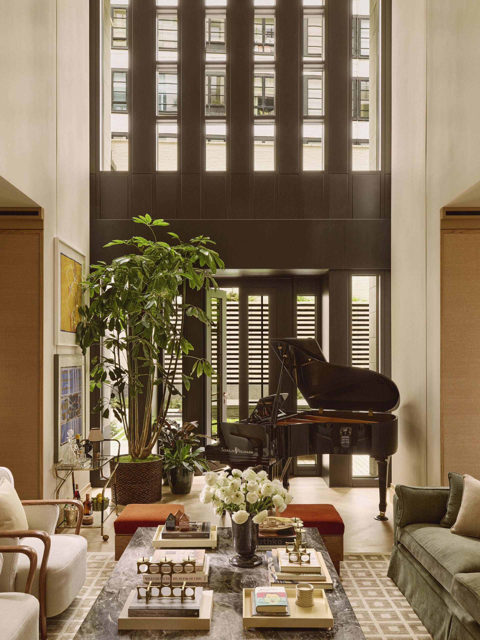 The expansive three-bedroom, 4,550 sq. ft. residence opens with an elegantly designed entrance that creates a true sense of arrival, setting the tone for thoughtfully considered interiors throughout. A generous lobby, anchored by a Robin Myerscough bronze console table and antiqued mirror, naturally leads into a voluminous double-height reception room where an abundance of natural light and spatial flow shape the space.