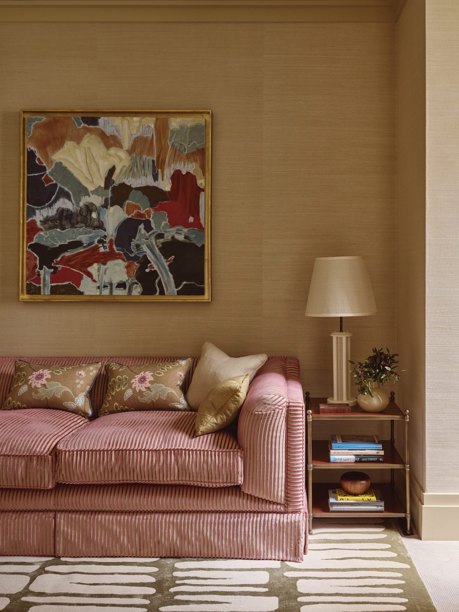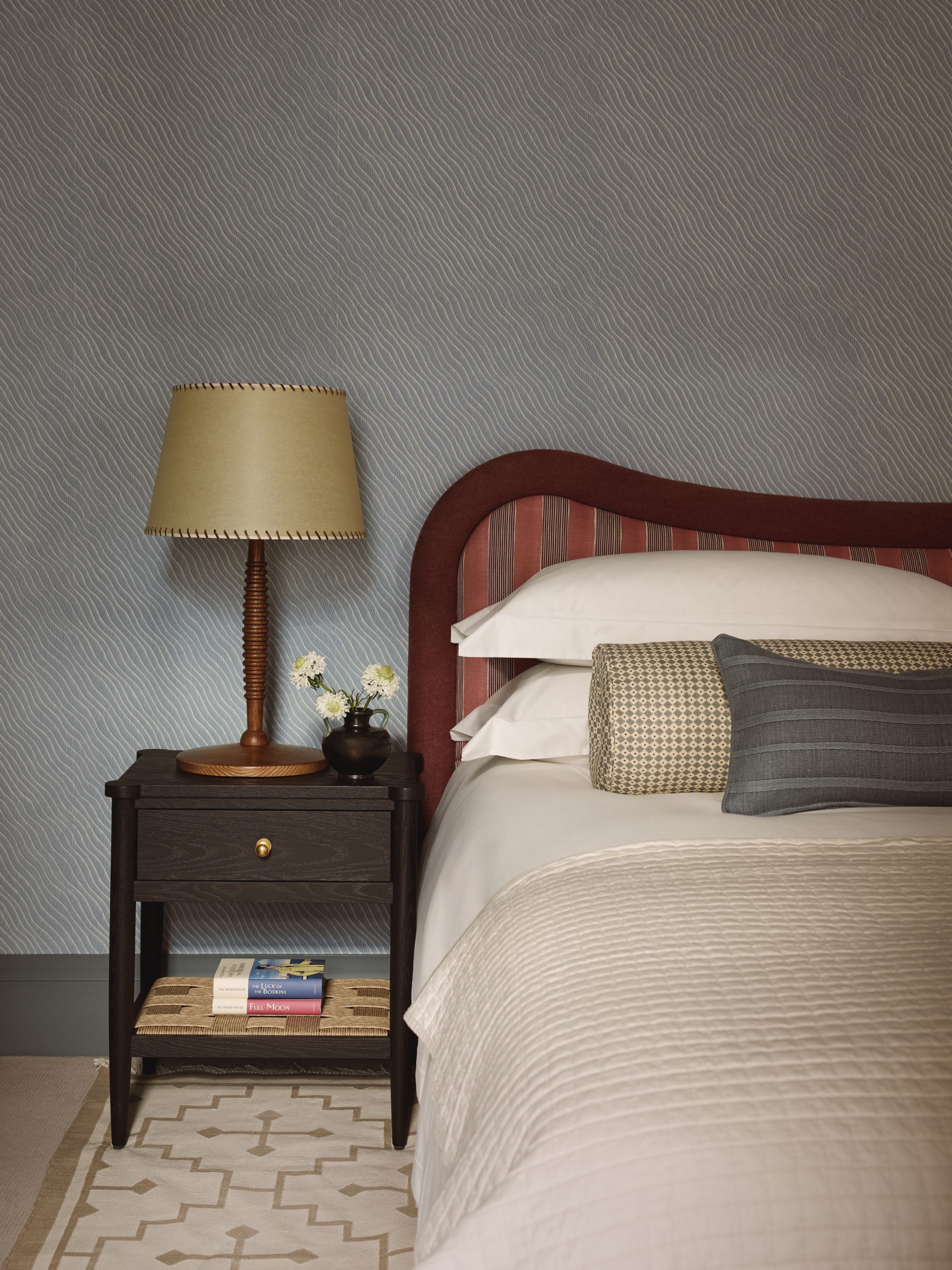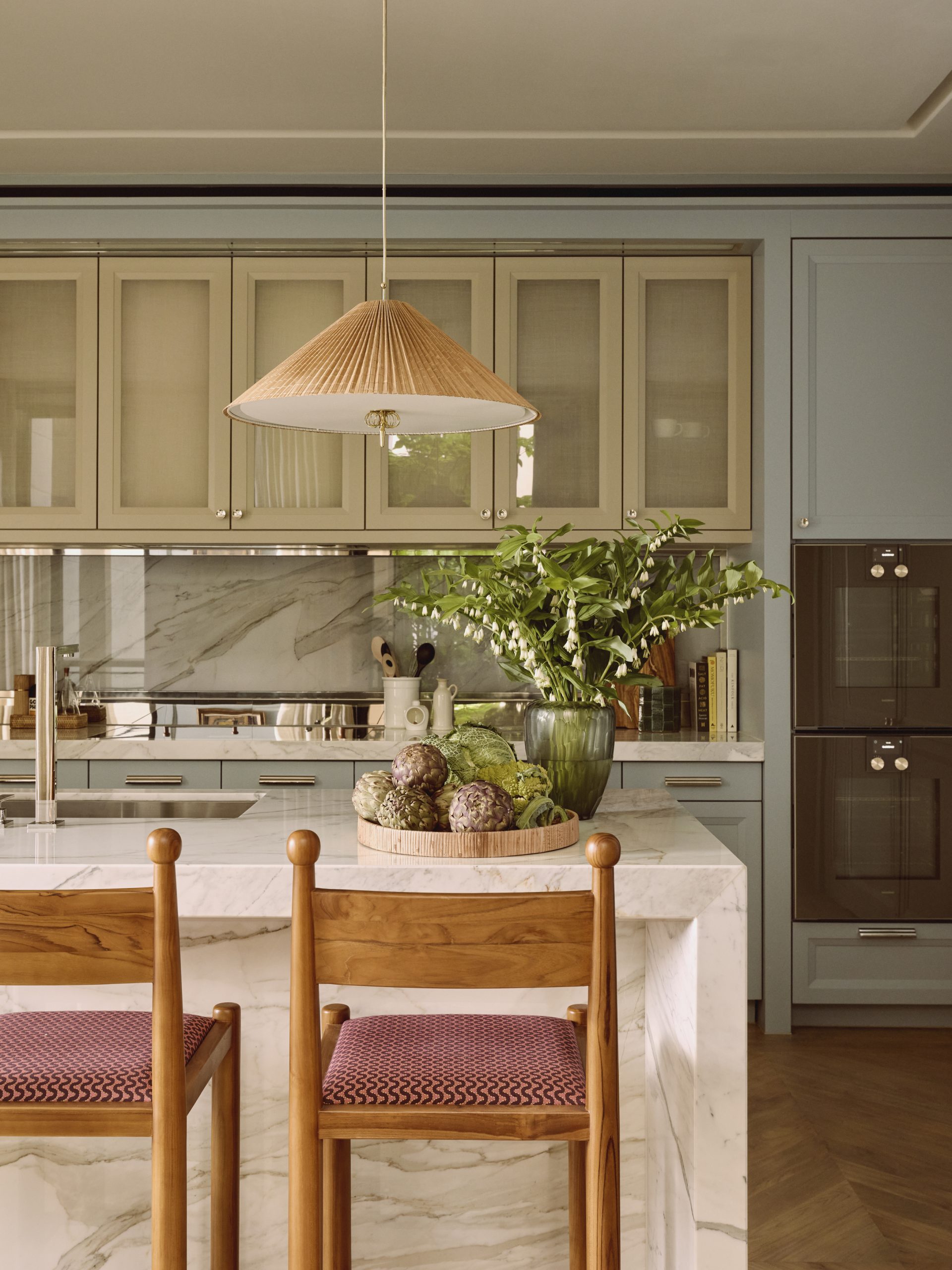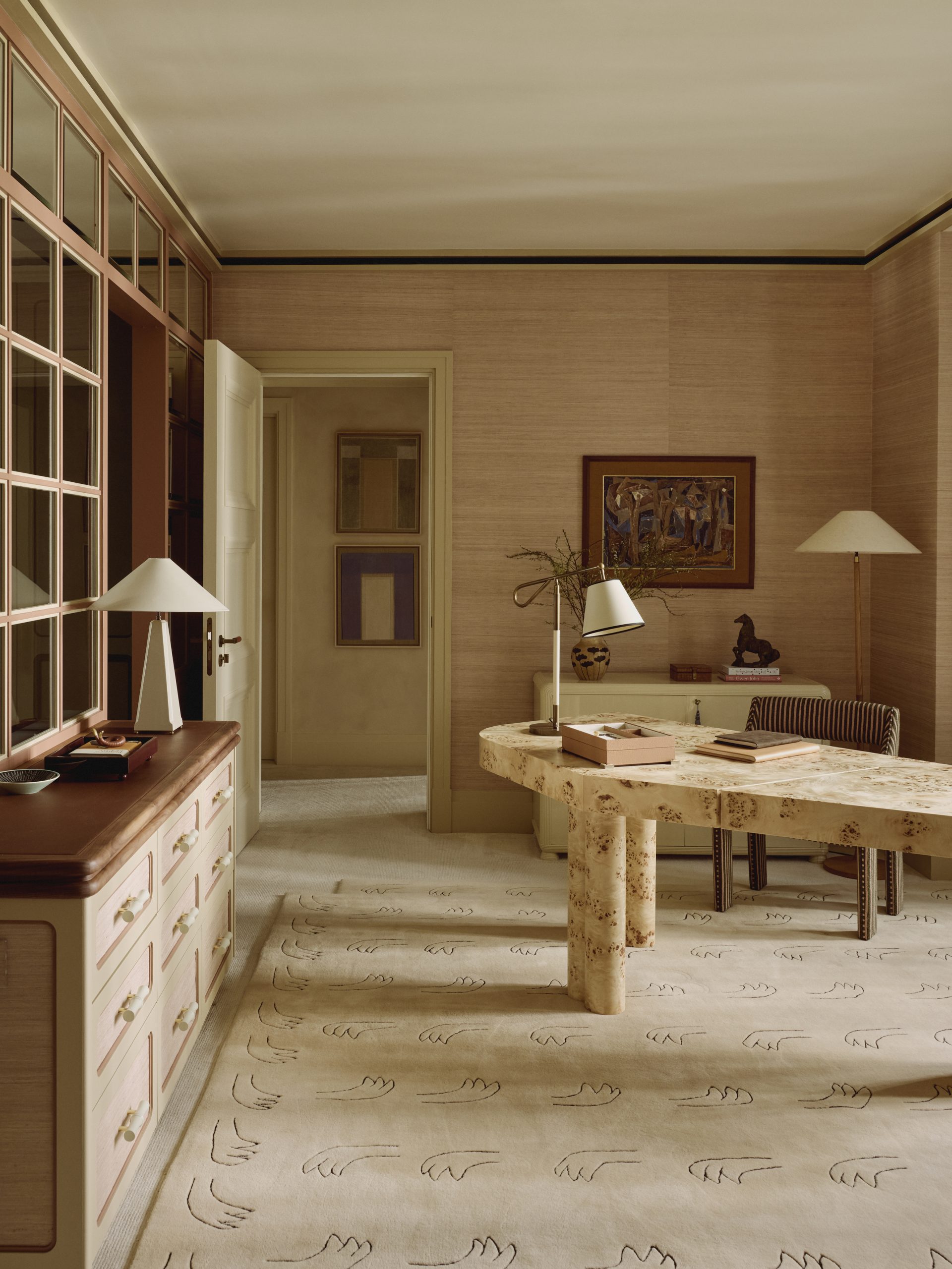 Walls are adorned with Philip Jeffries’s Manila Hemp wallpaper, providing a neutral backdrop for the accents of cerulean, blue, dusty pink, and rich reds. Within this living area, subtly zoned with bespoke rugs and curated furniture – including a custom Arabescato Orobico Grigio marble coffee table, walnut wood armchairs, and conker-coloured velvet stools – each section flows harmoniously while maintaining its own distinct purpose. Framed by leafy garden views, a grand piano serves as a striking visual centrepiece that embodies the social ambiance envisioned by De Rosee Sa during the apartment’s design.