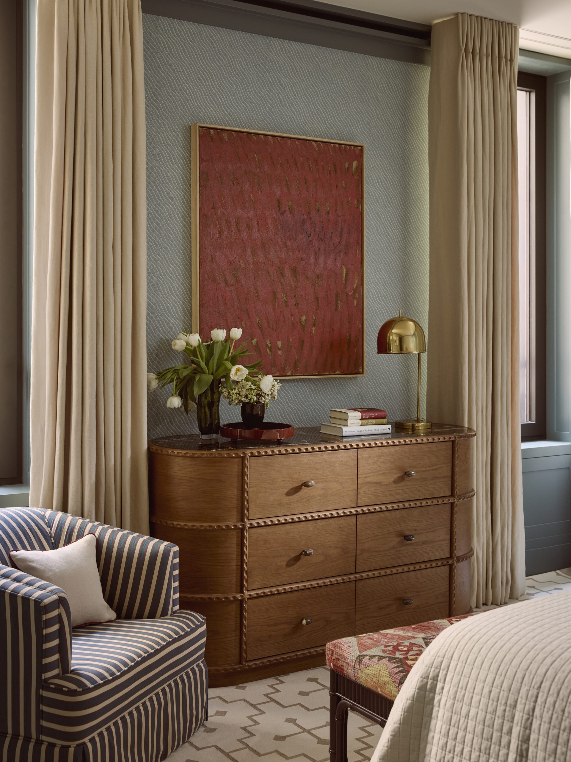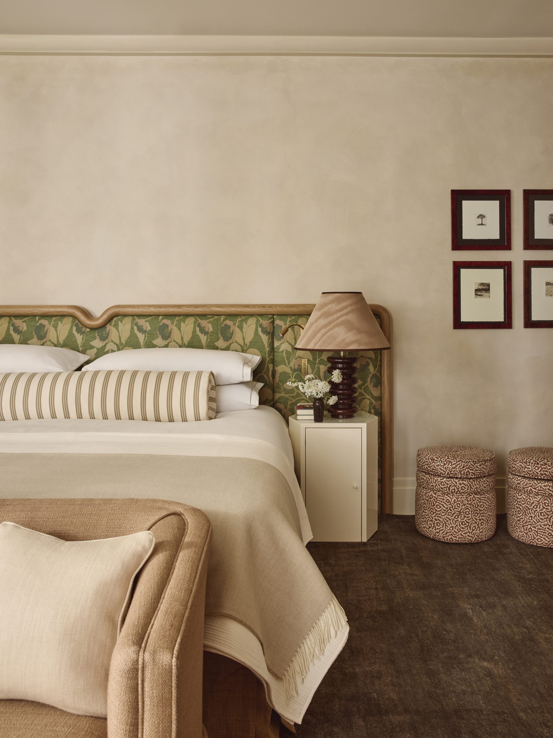 Upstairs, three generously sized bedrooms continue De Rosee Sa’s thoughtful layering of colours and materials, each designed with its own individual character. The principal suite, complete with a velvet daybed, custom wardrobe doors clad in Dedar’s iris wall fabric and a Bauwerk limewashed backdrop, offers a serene retreat. Meanwhile, a curated selection of artworks and vintage furniture inject personality throughout the secondary bedrooms.