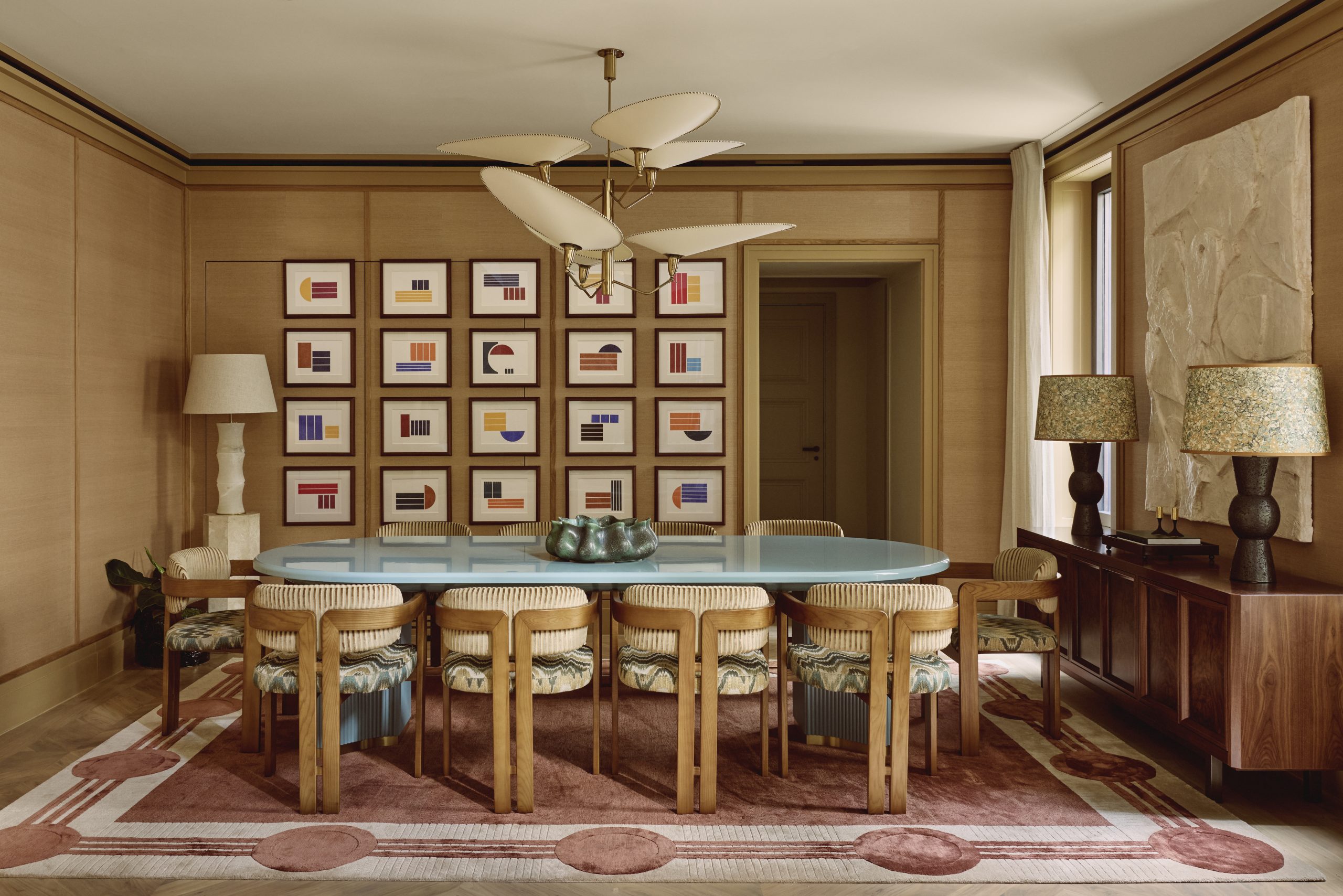 Walls are adorned with Philip Jeffries’s Manila Hemp wallpaper, providing a neutral backdrop for the accents of cerulean, blue, dusty pink, and rich reds. Within this living area, subtly zoned with bespoke rugs and curated furniture – including a custom Arabescato Orobico Grigio marble coffee table, walnut wood armchairs, and conker-coloured velvet stools – each section flows harmoniously while maintaining its own distinct purpose. Framed by leafy garden views, a grand piano serves as a striking visual centrepiece that embodies the social ambiance envisioned by De Rosee Sa during the apartment’s design.