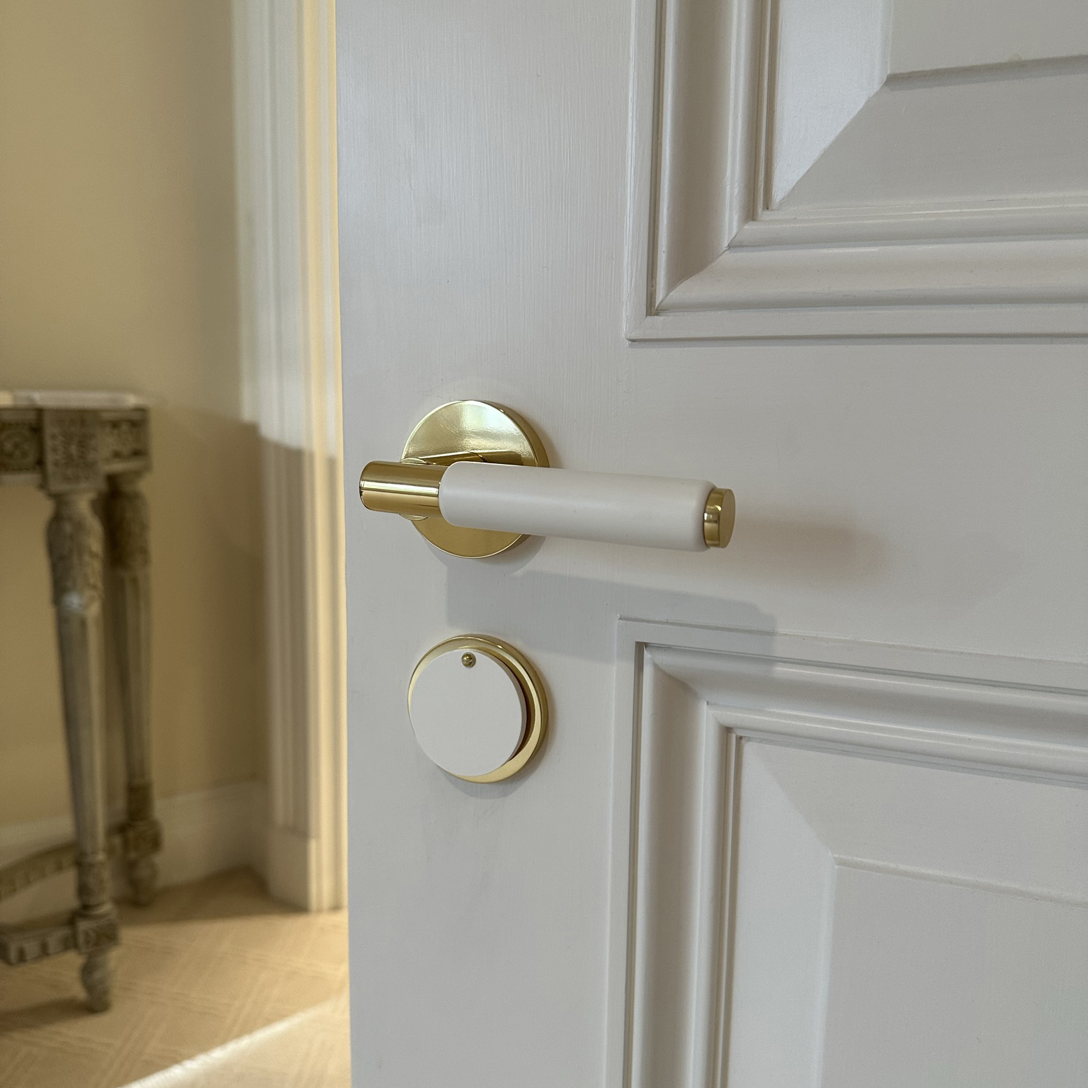 For this project, the finish chosen for the Arbor fittings was polished brass with colour coated wooden parts. Five different shades of white colour coating were used to match the décor of each area. The doors were larger than standard. Therefore, the lever handles were increased in size to keep in proportion. American locks were to be installed. Consequently, Silver Kite modified the Arbor items to be compatible with them.