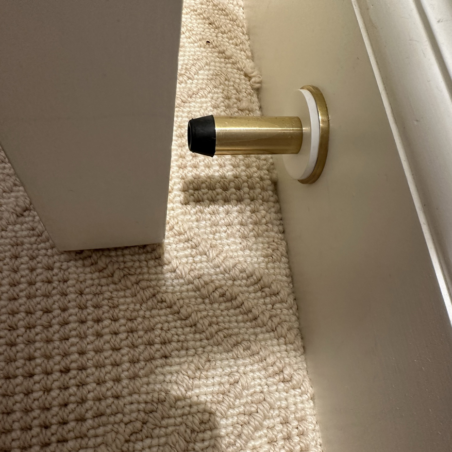 Door stops were used throughout, both floor mounted and wall mounted as shown.The windows were fitted with mortice espagnolette bolts. Arbor fasteners were specified, with the wooden part colour coated. Fittings in the bathrooms were polished chrome plated so the Arbor products were finished accordingly.