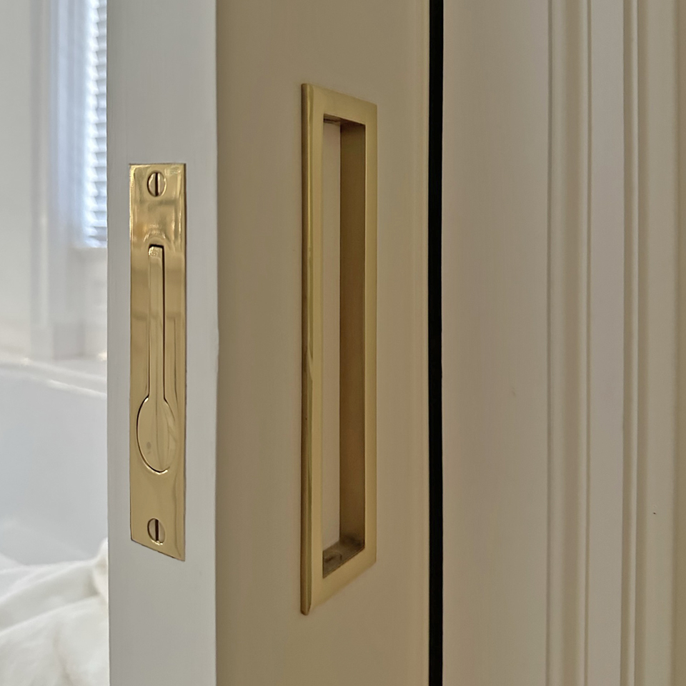 Many doors were sliding pocket doors. These were fitted with flush pull handles and door edge pulls. The flush pulls incorporated colour coated plates to match the door finish. Several doors were concealed jib doors so the door fittings had to be as unobtrusive as possible. For these the manufacturer made edge pulls with the outer body colour coated to match the door finish. To use this edge pull the protruding nib is pushed in so the handle swings out.