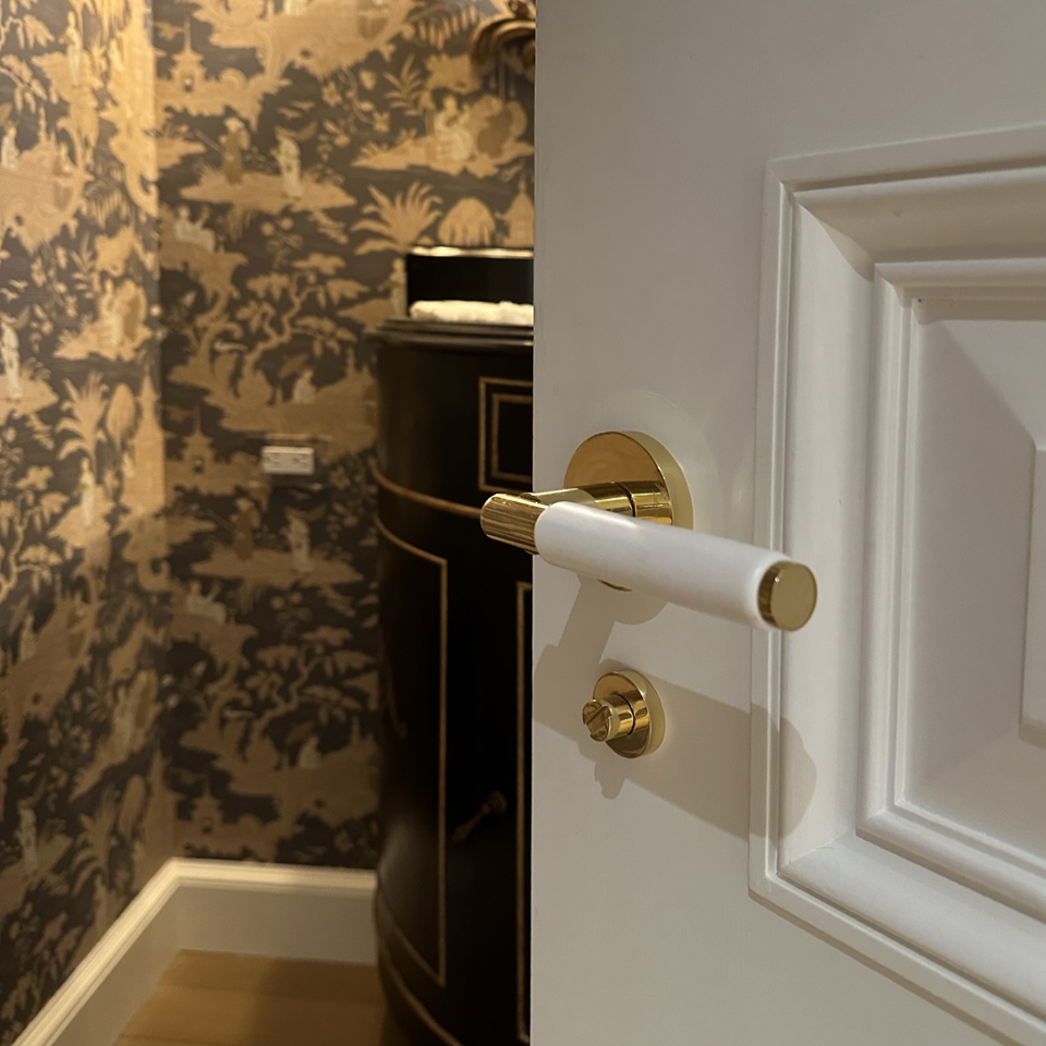 The designer wanted to upgrade the status of the reception rooms, so the lever handles in these areas were embellished as illustrated here. The bathroom doors were fitted with Arbor turnpieces and emergency releases, with the wooden parts colour coated as required.