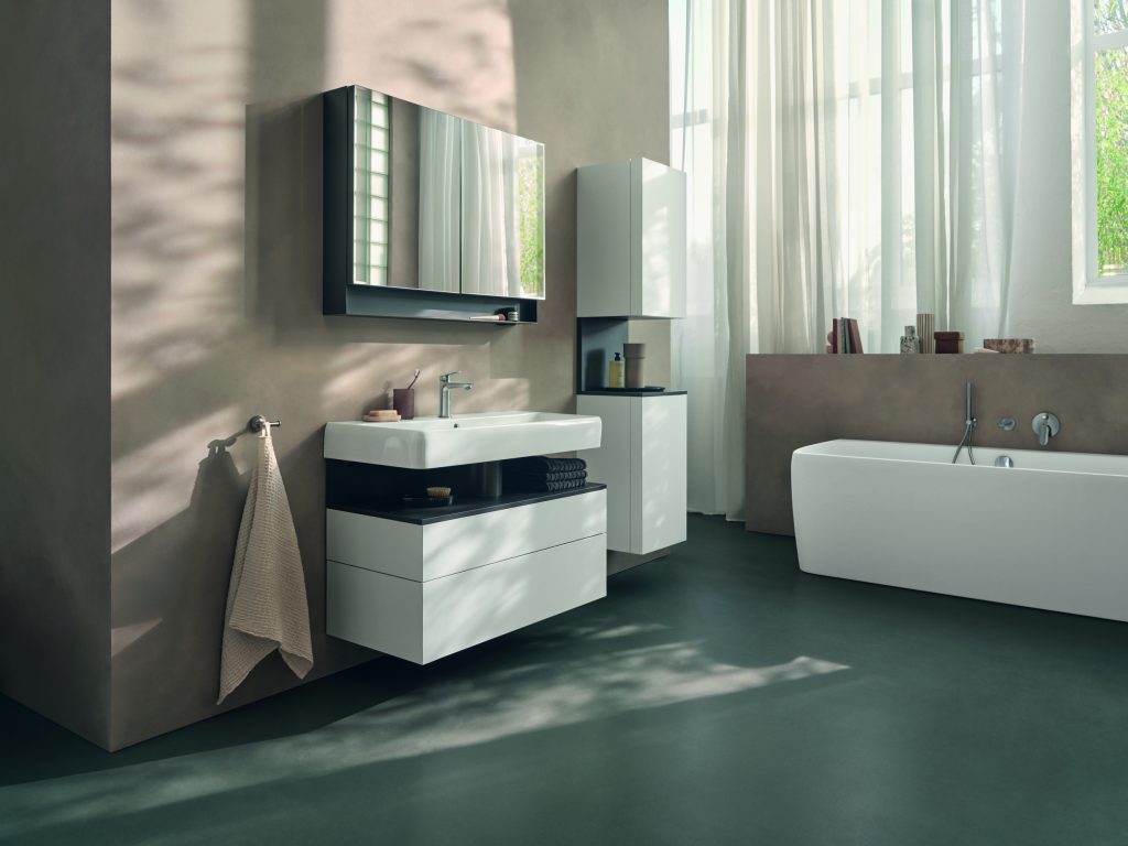 The washing area becomes the focal point. A generously proportioned ceramic basin sits above white drawers, intersected by an anthracite niche that introduces a sculptural shadow line. The illuminated mirrored cabinet and tall cabinet echo this interplay of light and dark, offering concealed storage inside and a vertical anthracite accent outside.